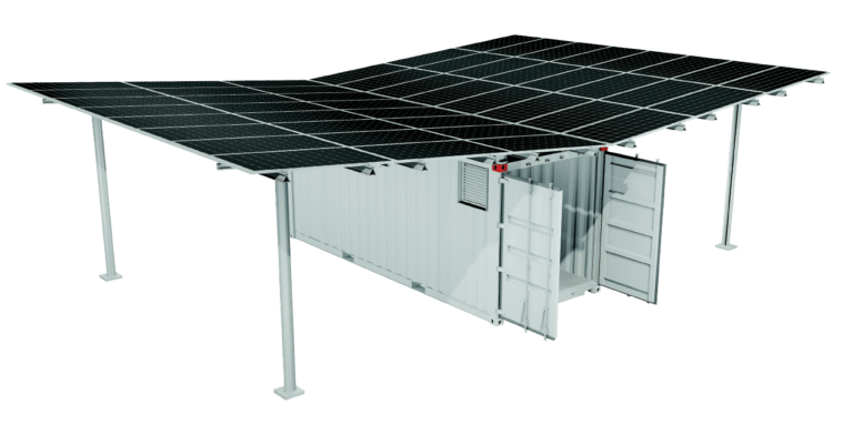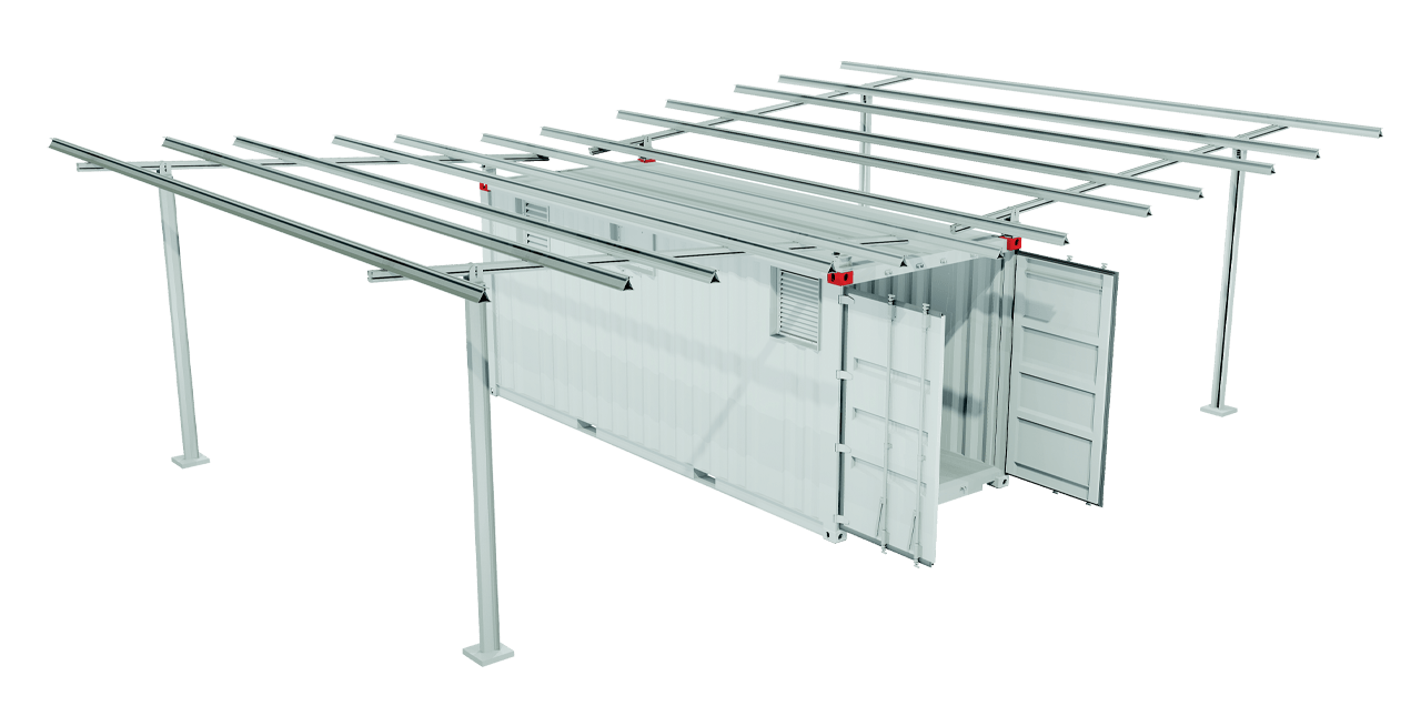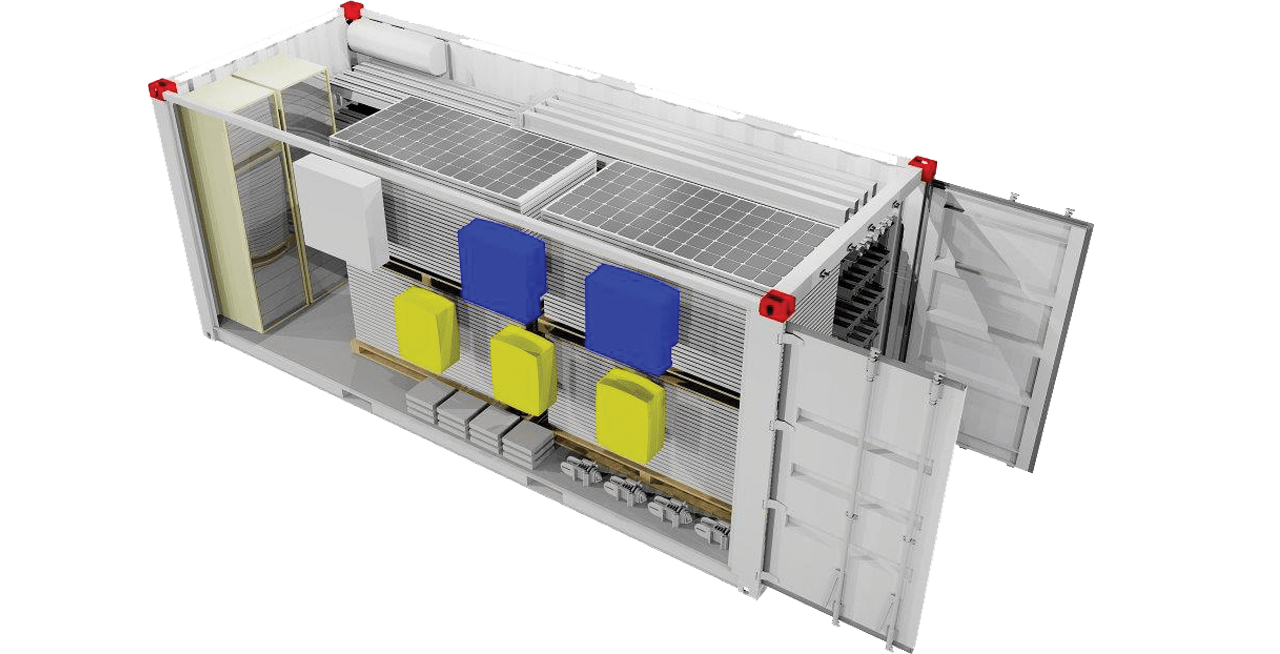 All solar modules, structures, batteries, and electronics are pre-installed and packed inside a 20 ft shipping container for safe and easy transport, including ladder, tools, and manuals for installation.